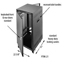 MIDPTRK21 - Middle Atlantic PTRK Series Portable Rack, 21 Space, (36.75" usable height)Specify a PTRK when a rugged, portable rack is essential. Smooth rolling 4" casters, advanced cable management and secure doors make this rack ideal for serving a variety of applications. Fully welded 16-gauge construction 1/8" thick structural steel internal braces Smooth-rolling 4" locking cushion casters Available with solid locking front door, or with graphite laminate top and plexi front door Rack Height: 21 space (36.75") Height without casters: 40.87" Overall Height with casters: 46" Depth: 23" (21-1/2" useable) Standard keylocked front & rear doors Rubber-padded spring loaded recessed handles Infinitely adjustable 10-32 threaded11-gauge rackrail 500 lb. weight capacity Durable textured black powder coat finish